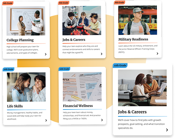 Get regular reminders and tailored action plans to help you track your teen’s progress from 8th grade to 12th grade.